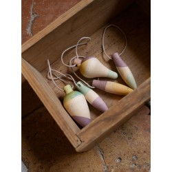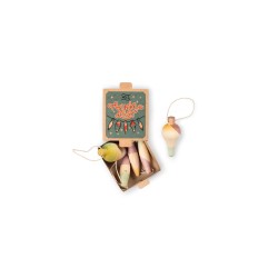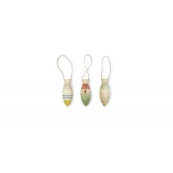 5 pièces de forme sphérique, peintes à la main. Comprend un fil pour les suspendre. De 25 mm ø à 40 mm ø Dès 36 mois.